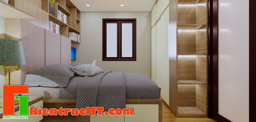 Không gian được tận dụng tối đa công năng, phòng ngủ kết hợp phòng làm việc, đọc sách. Bàn làm việc được đặt cạnh cửa sổ để hưởng trọn ánh sáng tự nhiên, hệ tủ sách kịch trần, rộng rãi, tiện lợi cho công việc. Tủ áo kịch trần tận dụng diện tích, không gian treo đồ.